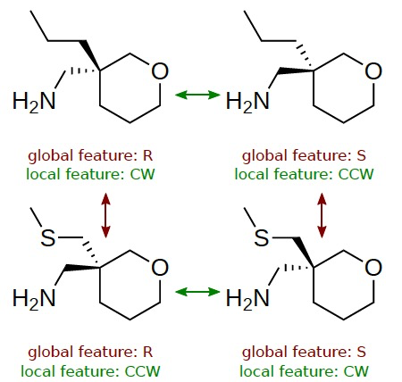 On the surface, MPNNs could capture stereochemistry through global descriptors such as R/S atomic features, differentiating enantiomers (non-superimposable stereoisomers, mirror images) using these features. These global descriptors represent a holistic measure of chirality, determined by the CIP (Cahn-Ingold-Prelog) side-chain ranking rules. However, Figure 1 illustrates why global chiral descriptors as atomic features are insufficient to meaningfully distinguish these structures within MPNNs. With global descriptors, two "R" structures would receive the same atomic-level features, while two "S" structures would receive different features. Yet, despite sharing the same global descriptor, the local arrangement around the tetrahedral center differs for each "R" structure.