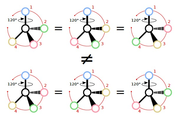 Another approach involves capturing relevant information through local chiral descriptors, indicated by CW/CCW labels as shown in Figure 1, commonly used in SMILES representation. Chiral centers are assigned odd/even labels (CW or CCW) based on the order of neighboring atoms relative to their spatial orientation (as provided in the given SMILES string), assigning them to one of 12 equivalent arrangements of local chirality groups. The authors' model combines this local parity bit with an ordered set of neighbors, as opposed to using the parity bit directly as an atomic feature, in order to preserve physically meaningful invariance and avoid sensitivity to arbitrary notations and SMILES normalization conventions.