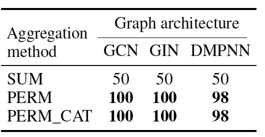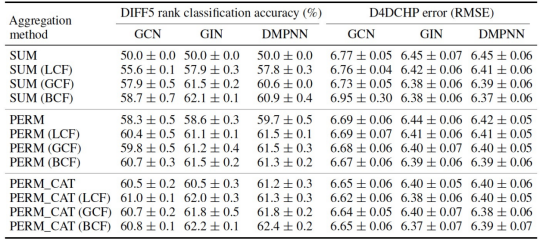 Next, empirical performance is evaluated on the full D4DCHP dataset. In the absence of atomic-level stereochemical features, the asymmetric aggregation methods PERM and PERM_CAT exhibit significant advantages over the SUM aggregator baseline. When stereochemical features are present, the performance of different aggregation methods depends on the architecture. Custom aggregation functions show measurable improvements in ranking classification and RMSE for the GCN architecture. However, for the GIN and DMPNN architectures, these improvements are less pronounced. For GIN, the inclusion of atomic-level stereochemical features captures trends that the custom aggregator captures when these features are absent. In the case of DMPNN, custom aggregators provide improvement in ranking classification but not in RMSE. The strong impact of atomic-level stereochemical features is noteworthy. By including just two additional atomic-level features, the SUM aggregator achieves around a 10% increase in ranking classification accuracy Regardless of how the graphical architecture is designed, more expressive graphical architectures can use this three-dimensional information more effectively. As a result, the explicit isotropy provided by custom aggregators no longer offers significant advantages. However, the highest observed ranking classification accuracy of 62% still has room for improvement, which stimulates further research into learning methods that can better handle the representation of tetrahedral stereochemistry.
